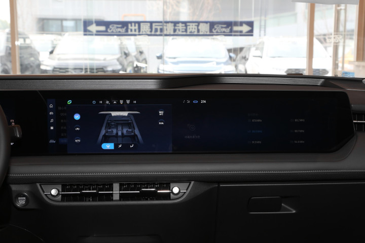 内饰和智能配置方面,我发现蒙迪欧走的是实用路线,没搞那些“为了科技而科技”的花哨设计,真正讲求系统稳定流畅、操作简便、功能实用。车内最醒目的配置是贯穿式27英寸大联屏,左侧是12.3英寸全液晶仪表盘,右侧是27英寸4K中控屏,合起来视觉冲击力十足,营造出宽敞且科技感强的驾驶舱氛围。这块屏幕支持分屏,驾驶者左边可看导航,副驾驶可在右边看视频,两人互不干扰,即便长途开车也能兼顾娱乐和导航。